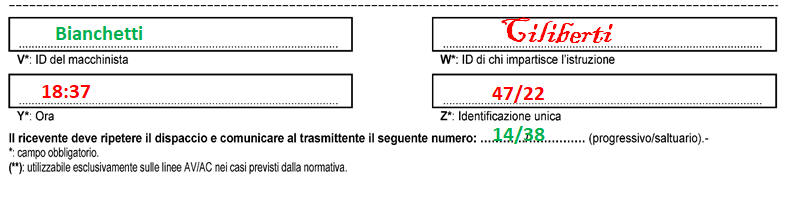 Nel rispetto dell'attuale normativa RFI, in aggiunta a quanto previsto dalla modulistica europea, è richiesto che l'agente di condotta che riceve l'istruzione, al termine della trasmissione deve dare una sua "identificazione unica" di conferma di ricevimento con gli stessi principi di quella trasmessa dal RdC.